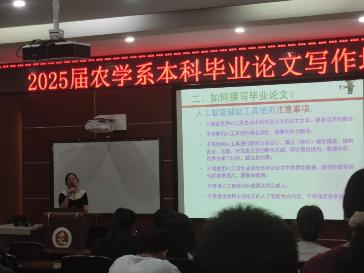 425日下午,为进一步提高公司本科毕业论文环节的教学质量,确保2025届本科生高质量地完成毕业论文,根据公司及公司工作安排,农学系组织2025届本科毕业生,在公司306会议室举行2025届本科毕业论文写作培训会。本次会议由农学系副主任韦茂贵担任培训教师,从“毕业论文普遍存在的问题”和“如何撰写毕业论文”两方面详细阐述了毕业论文撰写方法及注意事项。最后,韦老师还就毕业季其他重要事项的进度安排及注意事项一一告知,为农学系本科毕业生的顺利毕业提供指导。