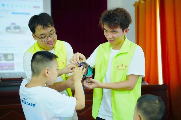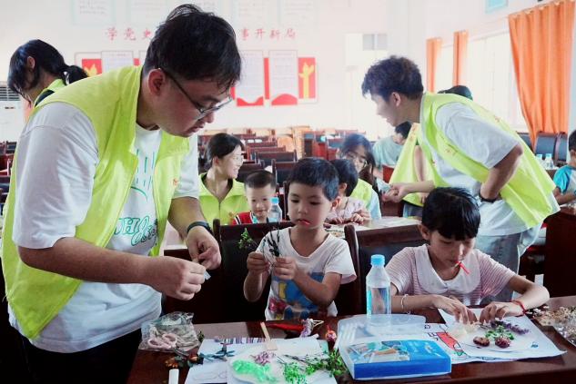 当实践团支农小队成员们出发调研时,这边实践团支教小队成员们已牵着一个个雀跃的孩子走向教室——这一天的支教时光,便在这般充满欢声笑语的景致里悄然启幕。心理绘画课上,孩子们用稚嫩的笔触描绘"喜欢的人和事",纯真的画作里藏着最动人的情感。手工环节中,五彩缤纷的扭扭棒在指尖飞舞,变成一个个有趣的,独一无二的作品,孩子们举着作品,脸上写满自豪。孩子们专注地制作干花团扇,又在昆虫科普中睁大好奇的眼睛,探索自然的奥秘。防溺水课上,“不能独自玩水!”“落水了要大声呼救!”稚嫩的童声此起彼伏,实践团成员们还通过情景模拟,让安全知识深入人心。最令人惊喜的是小苏打与白醋的实验,气泡翻腾间,实践团成员们同时普及艾滋疾病传播原理,课堂更加生动有趣。知识在游戏中传递,创意在指尖绽放,实践团成员们用爱心为孩子们的夏天描绘出绚丽的色彩,将希望的种子种在孩子们的心中,慢慢发芽。