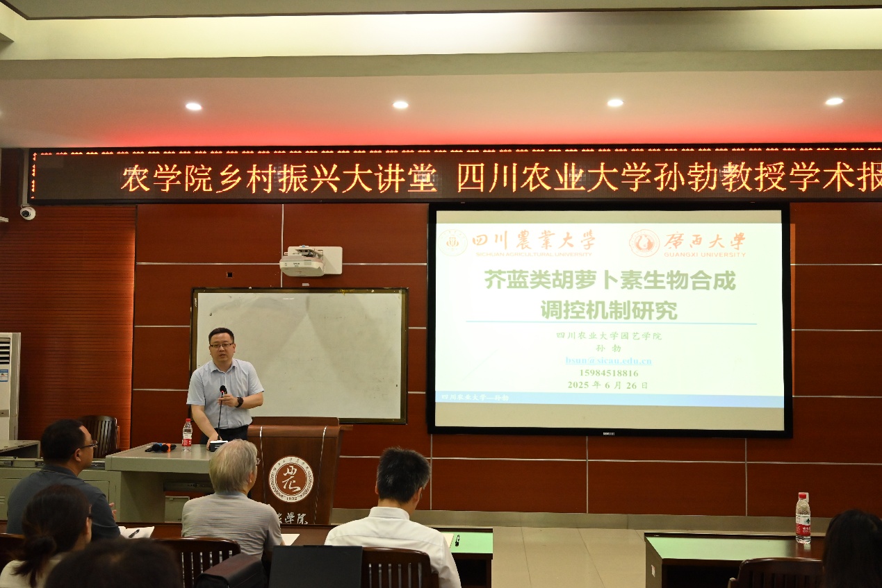 2025年6月26日,四川农业大学园艺公司副经理、博士生导师孙勃教授应邀莅临公司开展学术交流,并在“乡村振兴大讲堂”作题为《芥蓝类胡萝卜素生物合成调控机制研究》的专题学术报告。报告由bevictor伟德官网副经理邹承武主持,亚热带农业生物资源保护与利用国家重点实验室及bevictor伟德官网近百名师生到场聆听。