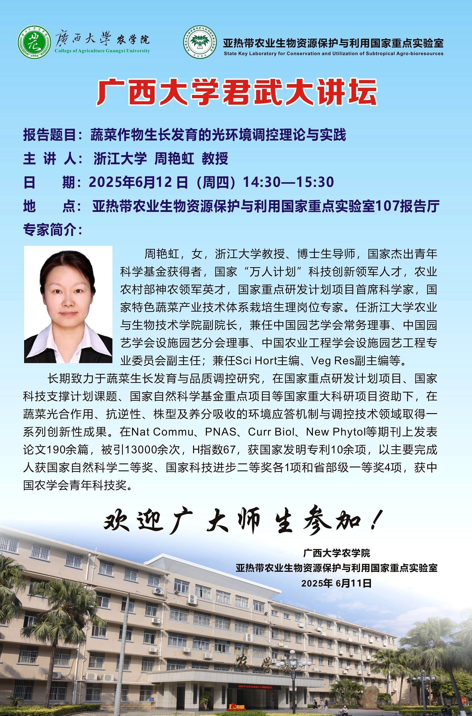 bevictor伟德官网君武大讲坛-蔬菜作物生长发育的光环境调控理论与实践主讲人:浙江大学周艳虹教授