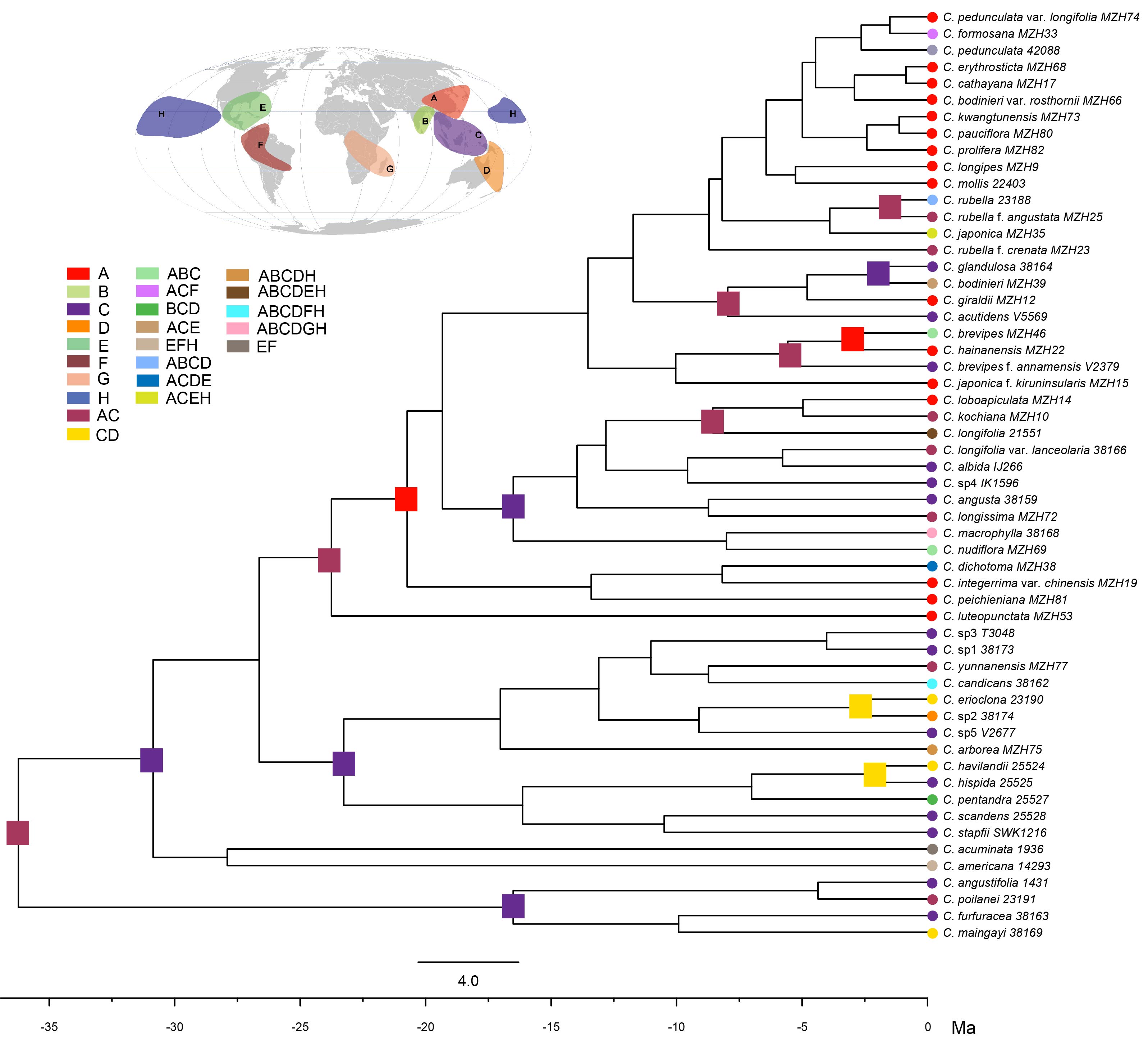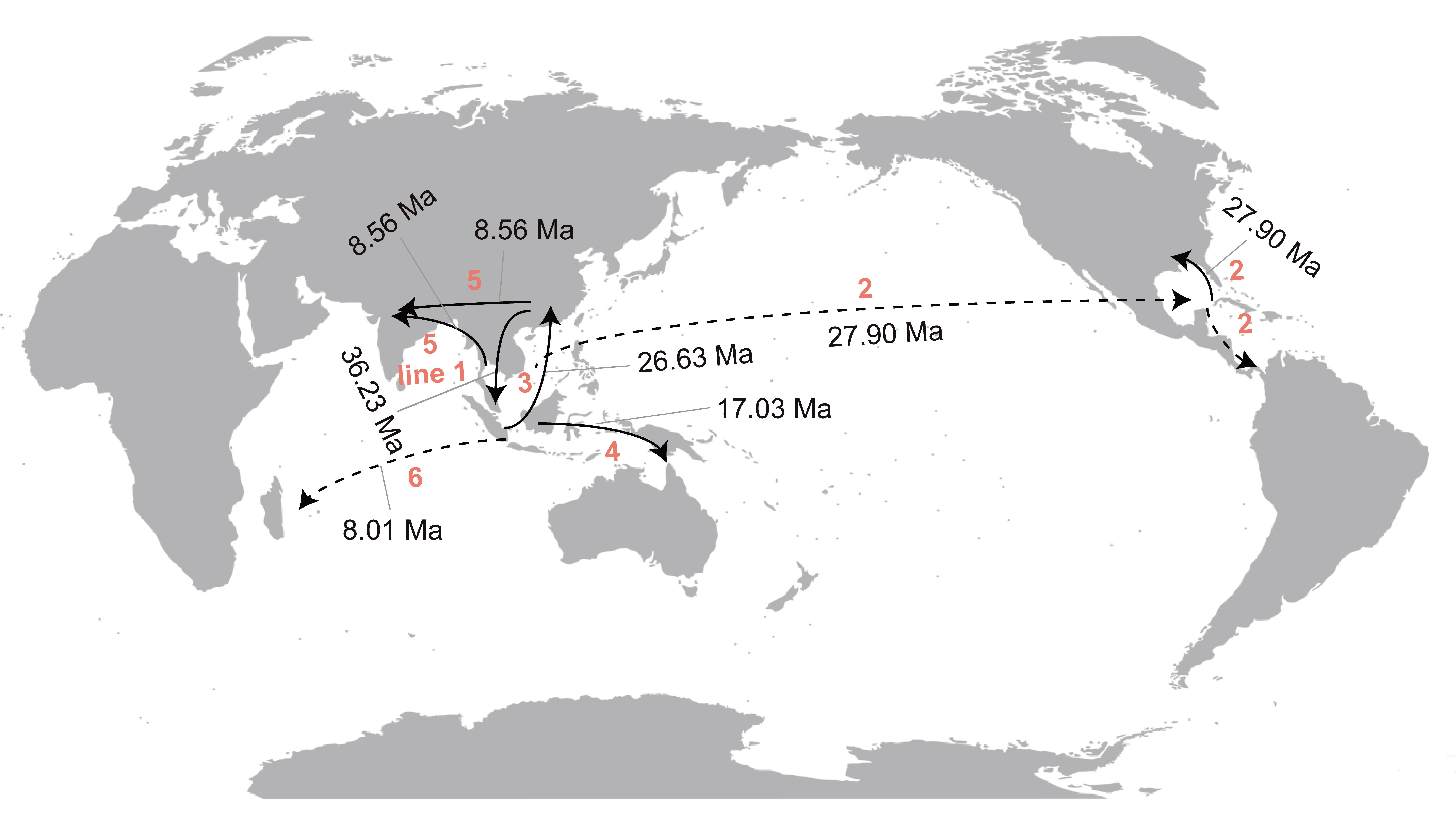 理解植物类群分布模式的形成方式一直是生物地理学领域关注的基础问题,同时分子钟和化石记录的使用为植物类群的进化引入了时间框架。其中环太平洋间隔分布模式吸引了不少研究者的兴趣与关注,且大多数研究聚焦于东亚与北美的温带植物类群。关于环太平洋热带间隔分布模式的形成,目前主要有两种支持假说:“Boreotropics”假说与“West Gondwanan vicariance”假说,此外,长距离扩散方式在跨洋间隔分布的种子植物类群研究中也得到了不少证明。唇形科紫珠属全世界约有140种,具有典型的东亚、东南亚亚洲-北美间隔分布式样,尤其在热带、亚热带区,该属的生物地理历史能否为泛热带植物类群的环太平洋间隔分布模式提供一定的参考价值?这让我们产生了兴趣。
