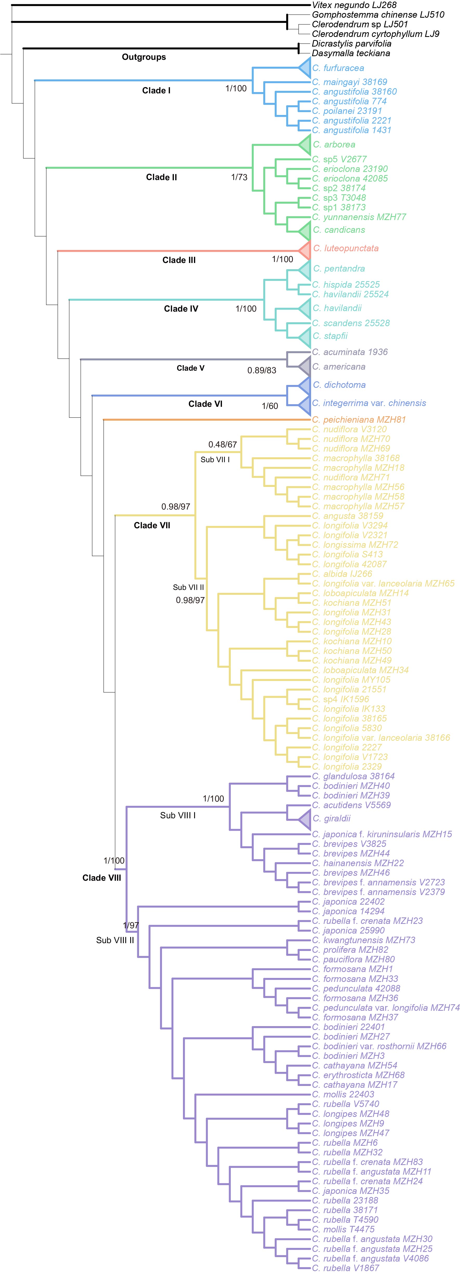 上述研究结果以“Phylogenetic relationships and biogeography of Asia Callicarpa (Lamiaceae), with consideration of a long-distance dispersal across the Pacific Ocean —insights into divergence modes of pantropical flora”为题发表于Frontiers in Plant Science第14卷(https://doi.org/10.3389/fpls.2023.1133157)。bevictor伟德官网硕士研究生蔡慧敏为论文第一作者,bevictor伟德官网马仲辉教授为通讯作者,本研究得到了国家自然科学基金(31760045, 31970220, 32260047)、广西自然科学基金(2018GXNSFAA281132)和广西甘蔗生物学重点实验室基金(GXKLSCB-202004)项目的资助。