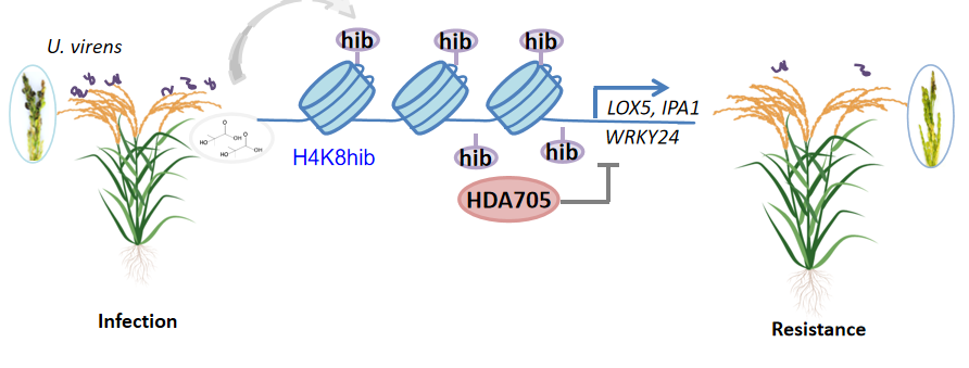 1. H4K8hib修饰通过促进抗病相关基因表达调控水稻抗病性的模式图